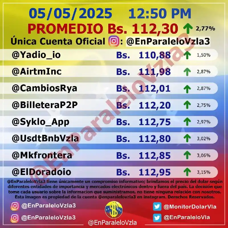 Pero, para la una de la tarde, el precio dio un salto y sobrepasó los 112 bolívares, para ubicarse en Bs. 112,30, registrando un incremento de 2.77% en solo unas horas.