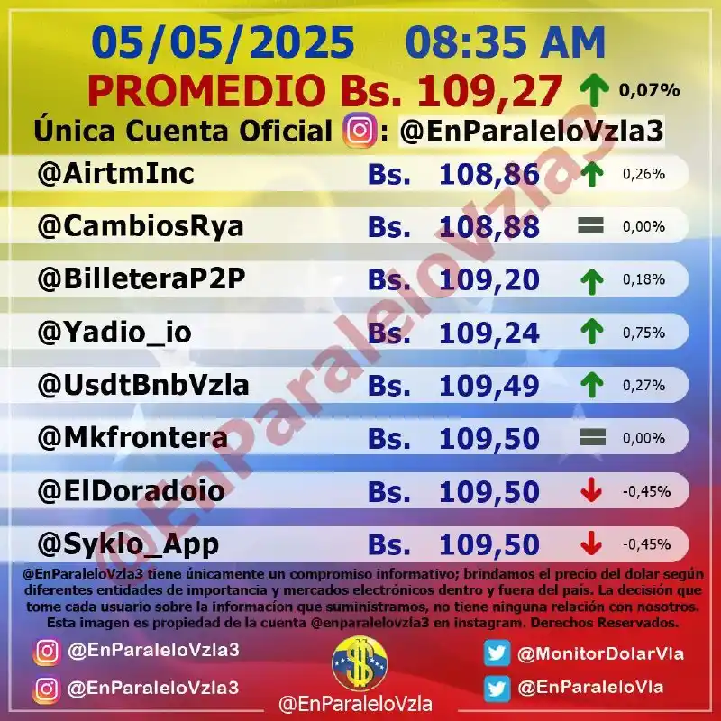 En cuando dólar paralelo, la cuenta En paralelo Vzla, informó que la cotización de la moneda para el comienzo de esta semana comenzó en 109,27 bolívares, un aumento de 0,07 % en relación con el pasado viernes 2 de mayo.