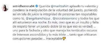 Por su puesto, su posición generó reacciones, entre ellas, la de la Miss Mundo 1984, Astrid Carolina Herrera, quien coincidió que esta decisión fue una descalificación a la voluntad del jurado.