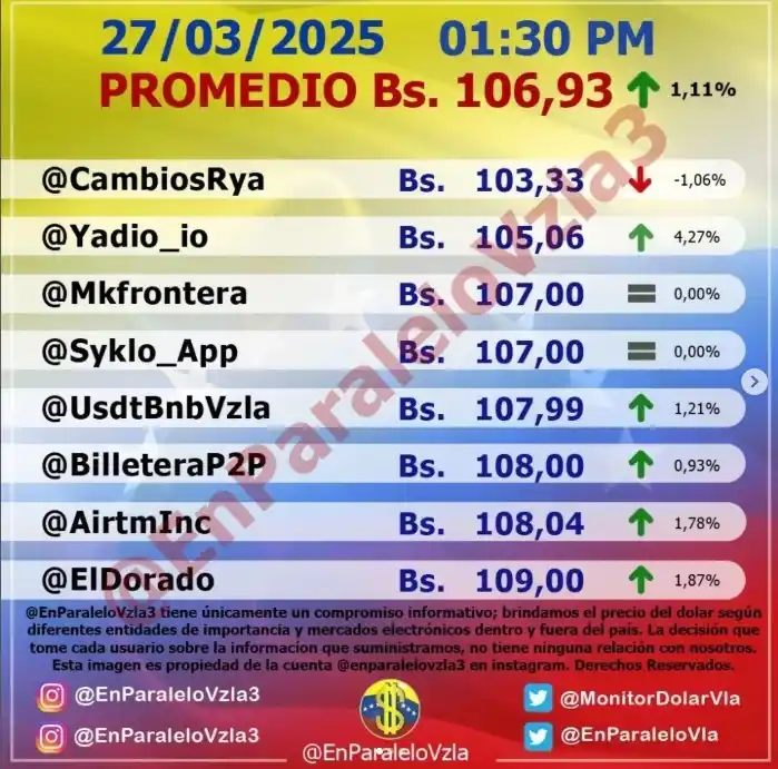 Entretanto, el dólar oficial se ubica en 69, 02 bolívares por dólar, es decir que está 37 bolívares por debajo del dólar oficial.