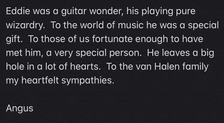 Angus Young del grupo AC/DC en sus historias de Facebook dijo que era «una maravilla en la guitarra. Su manera de tocar era mágica. Para el mundo de la música él fue un regalo especial», entre otras cosas.