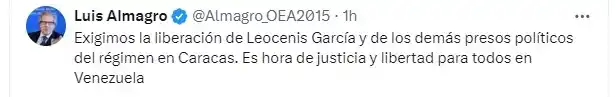 El secretario general de la Organización de Estados Americanos (OEA), Luis Almagro, exigió este martes la liberación del dirigente partidista y periodista Leocenis García, así como de los demás presos políticos en Venezuela.