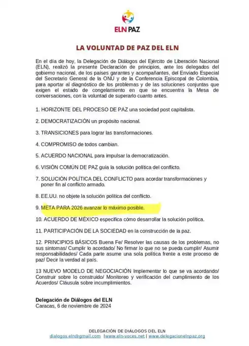 El Ejército de Liberación Nacional (ELN) manifiesta su «voluntad de paz» y propone un «nuevo modelo de negociación» para «implementar lo que se va acordando (…) y verificación del cumplimiento de los acuerdos», dijo la guerrilla en una declaración de principios difundida en X.