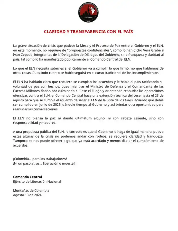 “La grave situación de crisis que padece la Mesa y el Proceso de Paz en este momento no requiere de propuestas confidenciales, sino franqueza y claridad al país, tal como lo ha manifestado públicamente el Comando Central del ELN”, dice un comunicado emitido por el grupo guerrillero en sus redes sociales.