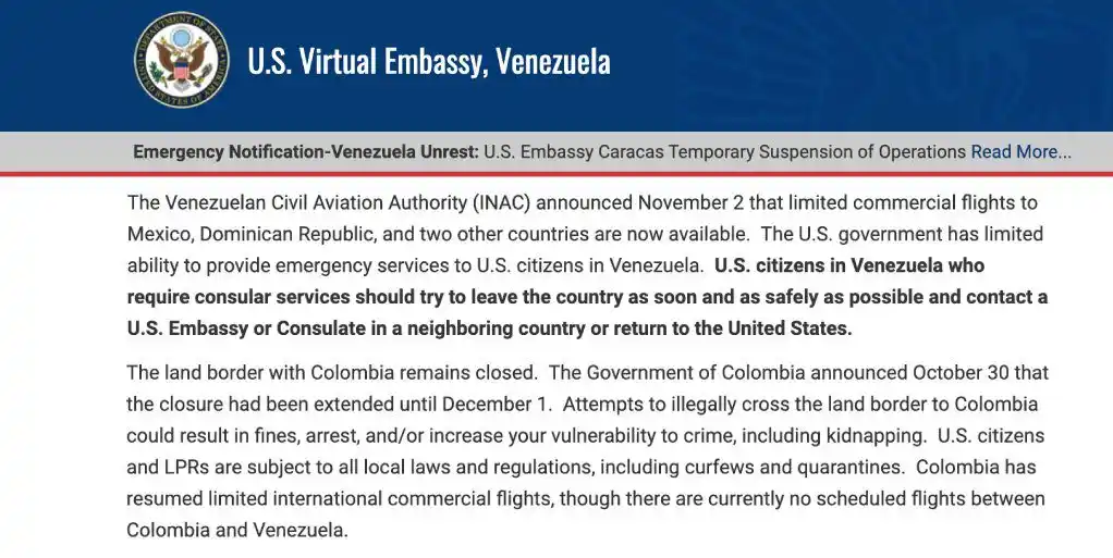 La embajada virtual de los Estados Unidos para Venezuela recomendó a los estadounidenses que se encuentran el país, «salir lo antes posible».
