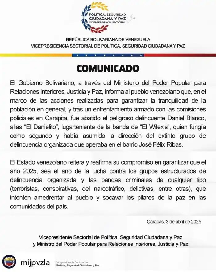 Cayó “alias Danielito”, segundo al mando de la extinta banda de “El Wilexis” en Petare, tras un enfrentamiento armado en Carapita, informó el Cicpc mediante un comunicado. pic.twitter.com/gWSPHNEn3l