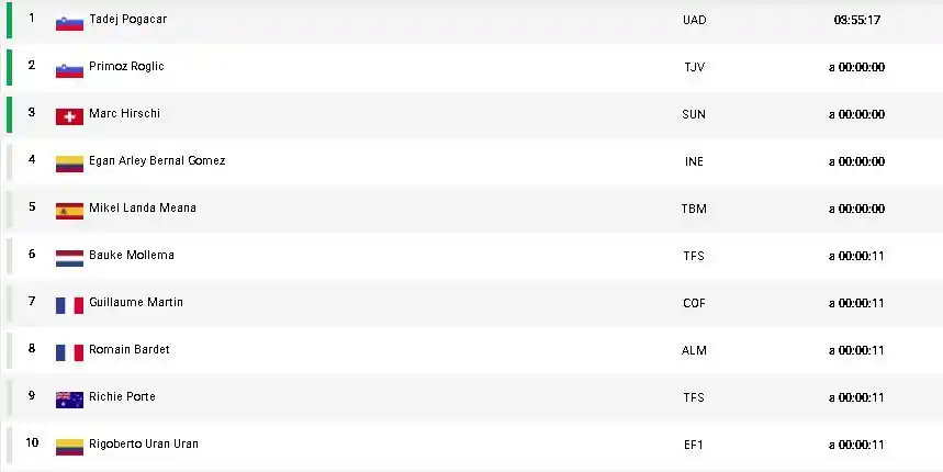 Primoz Roglic es el nuevo líder y Egan Bernal es segundo en la general, mientras que Nairo Quintana, Rigoberto Urán y Miguel Ángel López y ocupan el quinto sexto y noveno lugar respectivamente.