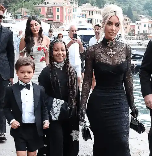Al igual que el resto de su familia, el traje que lució Kourtney Kardashian fue de la firma Dolce & Gabanna. Su esposo estuvo de smoking.
