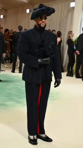 En brillantes zapatos de charol, Bad Bunny evocó a una especie de matador Tudor con un sombrero de ala ancha y un ramo de flores negras. Su único toque de color despuntaba en la parte interna de su pierna con una franja roja.