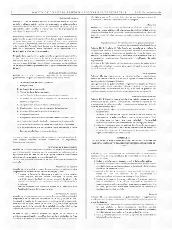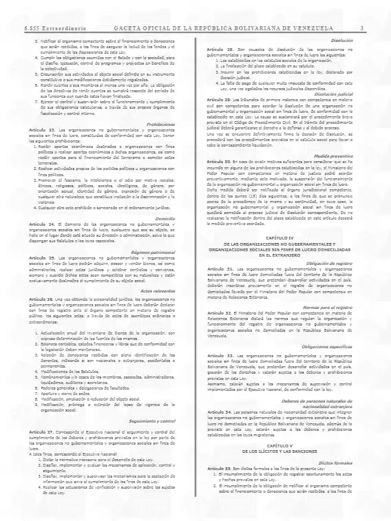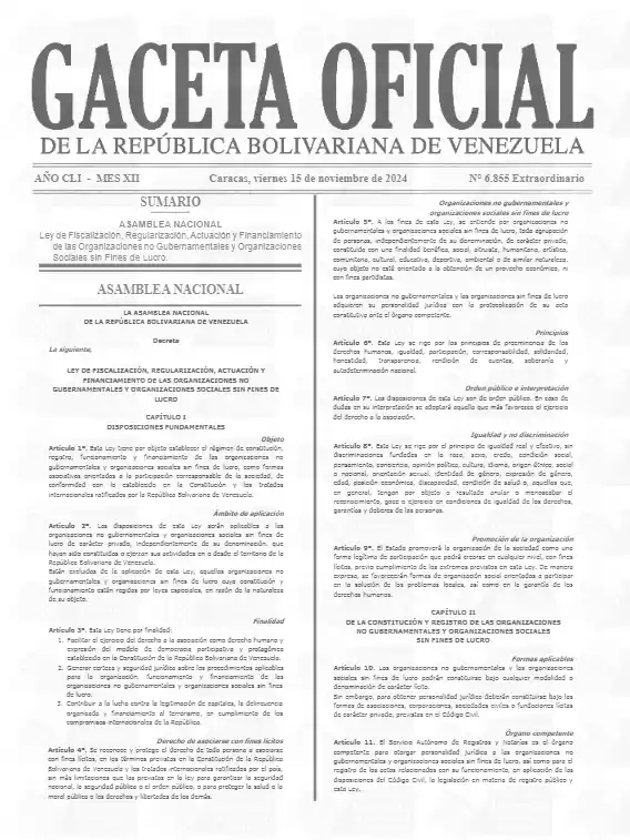 La Ley de Fiscalización, Regularización, Actuación y Financiamiento de las Organizaciones no Gubernamentales (ONG) y Organizaciones Sociales sin Fines de Lucro, está vigente, tras su publicación en la Gaceta Extraordinaria Nº 6.855, de fecha viernes 15 de noviembre de 2024.