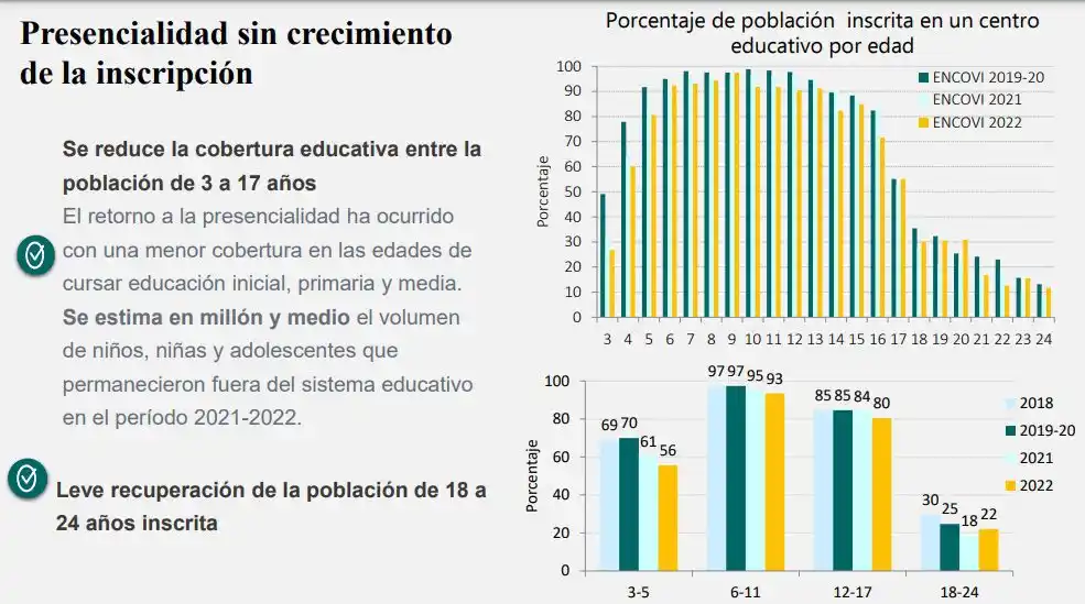 En ese sentido, Freites indicó que la cobertura educativa en la población de 3 a 17 años de edad se redujo en el último año, mientras que también preocupa la caída entre los niños de 3 a 5 años. En cuanto a la población de 18 a 24, hubo una leve recuperación con respecto al año pasado.