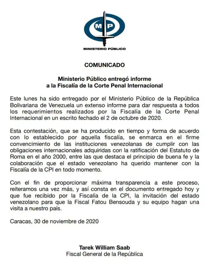 La información la dio a conocer el fiscal designado por la ANC, Tarek William Saab, en su cuenta en Twitter. En un comunicado escueto, Saab explica que también entregó «un informe con el que quiere dar respuesta a todos sus requerimientos» de la CPI, sobre la situación de los DD.HH en el país.,