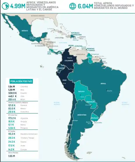 La crisis migratoria alcanza unos 6 millones de venezolanos, de los cuales hay por lo menos 1.800.0000 en Colombia y un 1.400.000 en Perú: estas dos naciones son las que tienen las comunidades más grandes de connacionales en la región. Seguidos de Ecuador, Chile y Brasil.