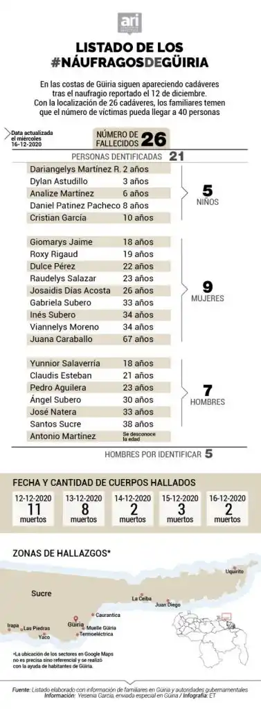 Medios de comunicación en el oriente del país confirmaron este jueves que ya son 26 las víctimas de la tragedia de Güiria. Esto, luego de que aparecieron más cuerpos en las playas. Incluso, se tienen los nombres y apellidos de 5 niños, 9 mujeres y 7 hombres. Solo quedan 5 hombres por identificar.