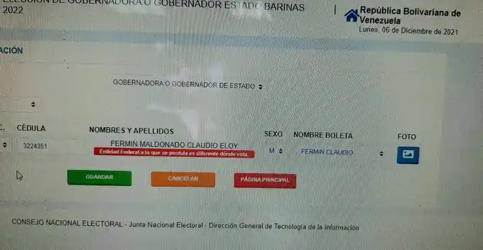 Se conoció que cuando quiso registrarse, el sistema automatizado de postulaciones del CNE no se lo permitió, en un primer momento. El «argumento» que arrojaba el sistema era que «no vota en Barinas».