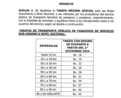 En la gaceta quedan establecidas las tarifas para las rutas urbanas que van entre 16 y 18 bolívares. Mientras que la tarifa máxima oficial para las rutas suburbanas en todo el país se ubica entre 16 a 43 bolívares, de acuerdo los kilómetros recorridos.