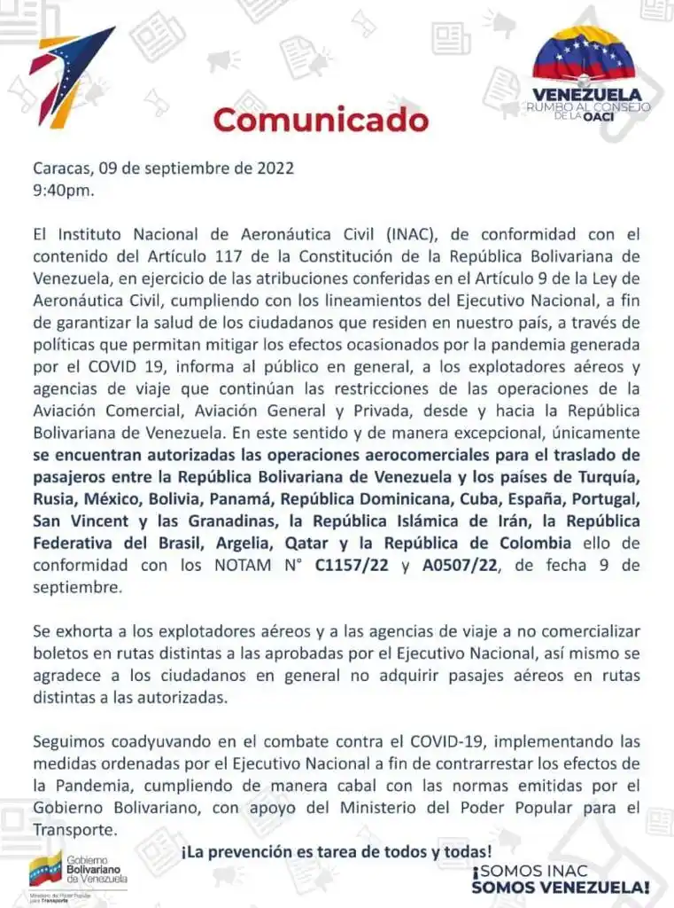 «El #INAC, cumpliendo con los lineamientos del Ejecutivo Nacional, informa medidas para el sector aéreo nacional de acuerdo a lo establecido en los NOTAM N.º C1157/22 y A0507/22», dice el Inac y luego agrega a Colombia al grupo de países con los cuales hay intercambios, vía aérea.