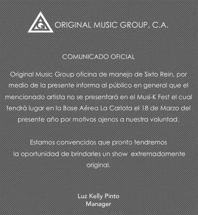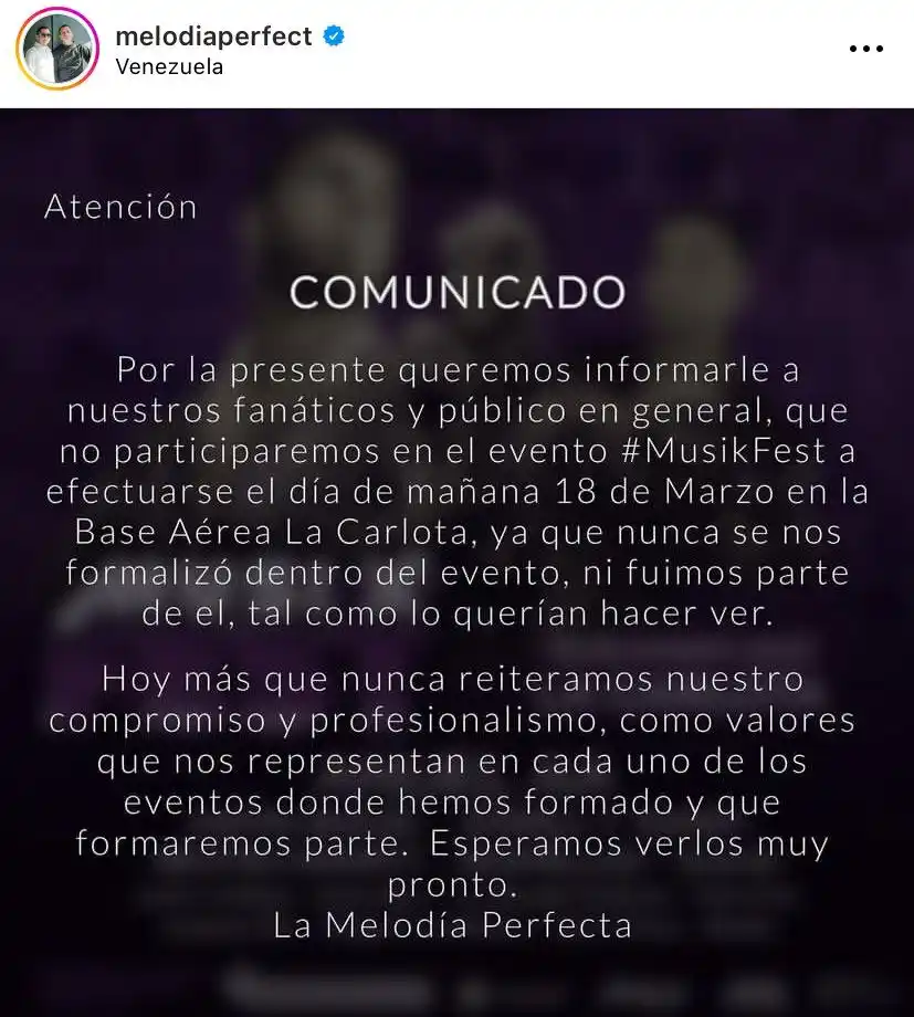 Problemas de logística, incumplimientos de contrato, son algunas de las razones que dieron los artistas que anunciaron en redes sociales que no estarán en el Musi-K Fest previsto a realizarse este sábado en la base aérea de La Carlota.