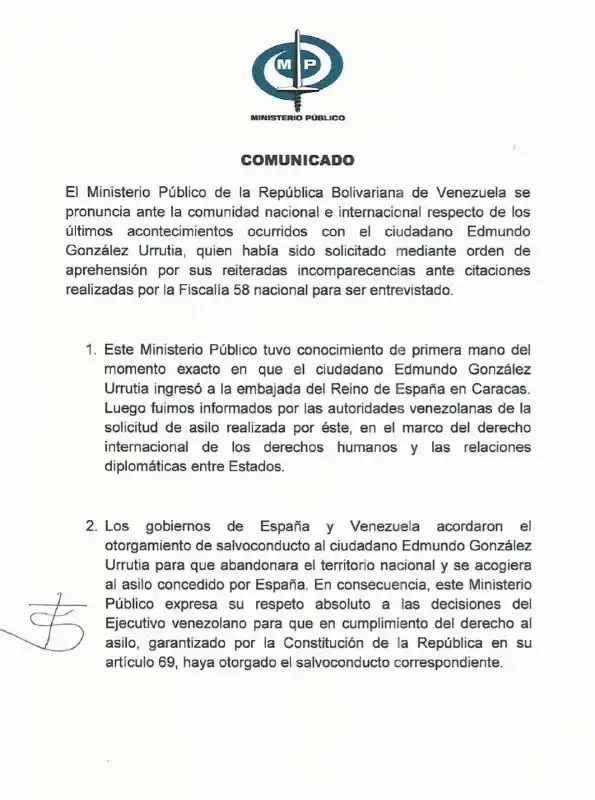 Mediante un comunicado, el fiscal informó que fueron los gobiernos de Venezuela y España los que acordaron el otorgamiento de los salvoconductos que permitieron que González abordara el avión de la Fuerza Armada de España, parea salir de Venezuela.