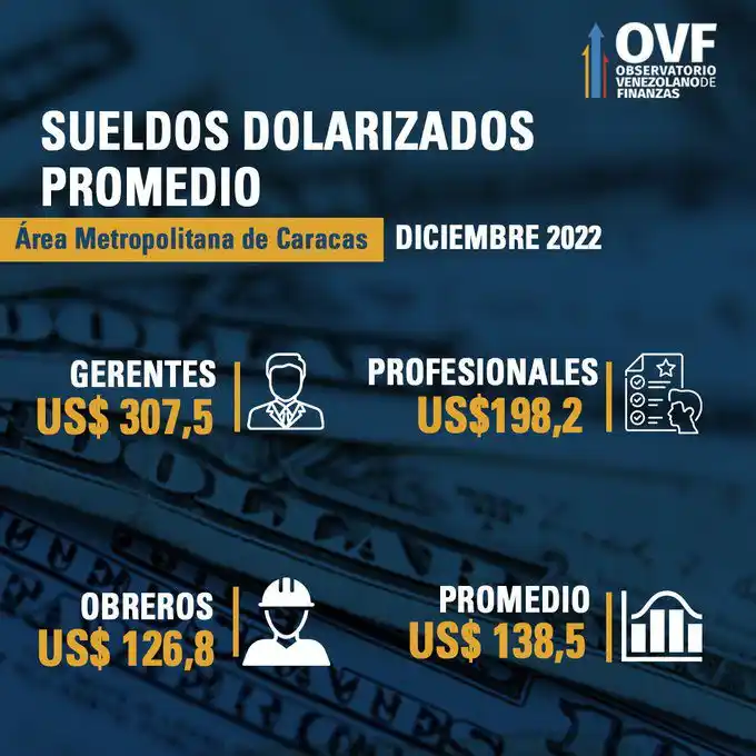 Según los cálculos del OVF «el salario promedio del sector privado, referido al comercio y servicios del Área Metropolitana de Caracas (AMC), se situó en diciembre de 2022 en $ 139 mensuales. Conviene mencionar que ese sector da cuenta de más de 60% de la ocupación de los cinco municipios que conforman el AMC».
