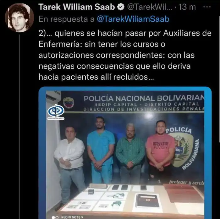 Asimismo, el fiscal de Maduro, aseveró que estos falsos psiquiatras también «Se hacían pasar por Auxiliares de Enfermería: sin tener los cursos o autorizaciones correspondientes: con las negativas consecuencias que ello deriva hacia pacientes allí recluidos».