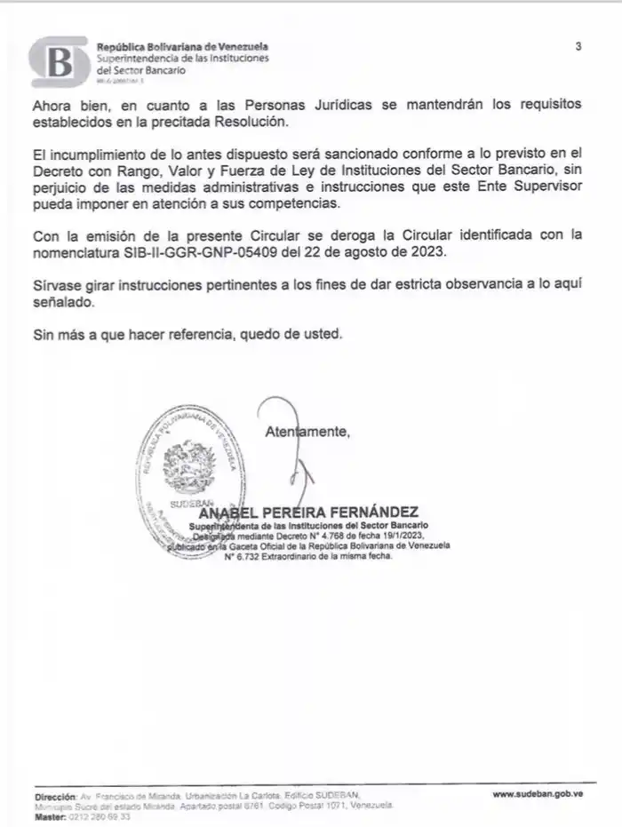 «Con el fin de ofrecer nuevas oportunidades garantizando la igualdad para los clientes, usuarios y usuarias en el proceso de bancarización (…) esta Superintendencia de las Instituciones del Sector Bancario considera necesario flexibilizar los requisitos para la apertura de cuentas bancarias», señala el documento enviado a las instituciones financieras tanto públicas como privadas.