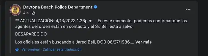 “Se le considera desaparecido y en peligro. Si sabe dónde está o tiene cualquier información, por favor póngase en contacto con el detective Jayson Wallace al 386-671-5207 o [email protected]”, señalaron en la publicación del 13 de abril de 2023.