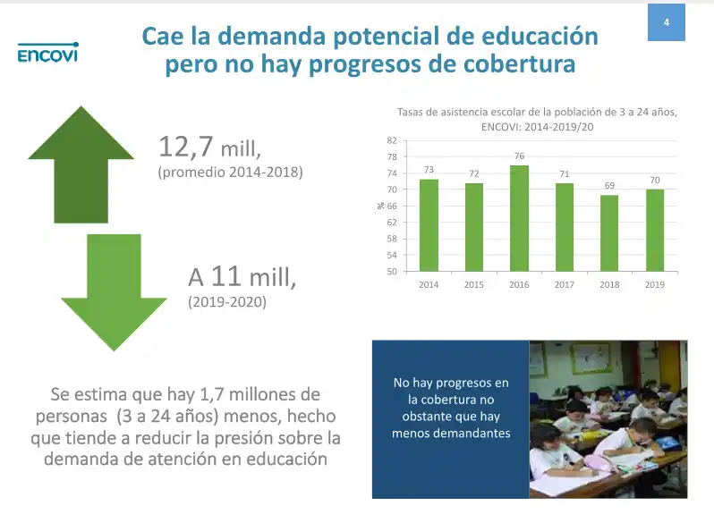 La calidad educacional en el país se ha deteriorado a medida que la crisis se agrava; actualmente la emergencia humanitaria, vinculada a la pandemia derivó que el país atraviese un gran retroceso en el marco educativo.