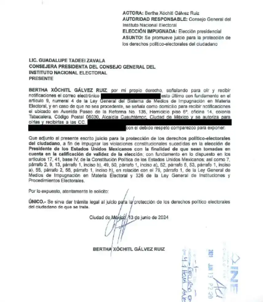 Pese a perder por abrumadora diferencia, la excandidata presidencial opositora Xóchitl Gálvez Ruiz presentó este jueves ante el Instituto Nacional Electoral (INE) de México una impugnación al proceso electoral 2023-2024 y pidió que abra una investigación.