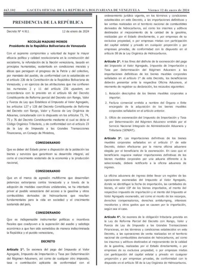 A través del Decreto N.º 4.911, publicado en la Gaceta Oficial N.º 42.797, de fecha 12 de enero de 2024, la administración de Nicolás Maduro, exoneró el pago de impuestos, por un año, a las importaciones y ventas de combustibles derivados de hidrocarburos en Venezuela.