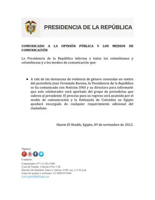 Juan Fernando Barona –quien trabajaba para Noticias Uno– fue retirado del grupo de periodistas que cubren la gira presidencial de Gustavo Petro en la COP 27 de Egipto.