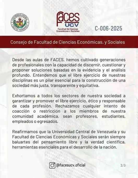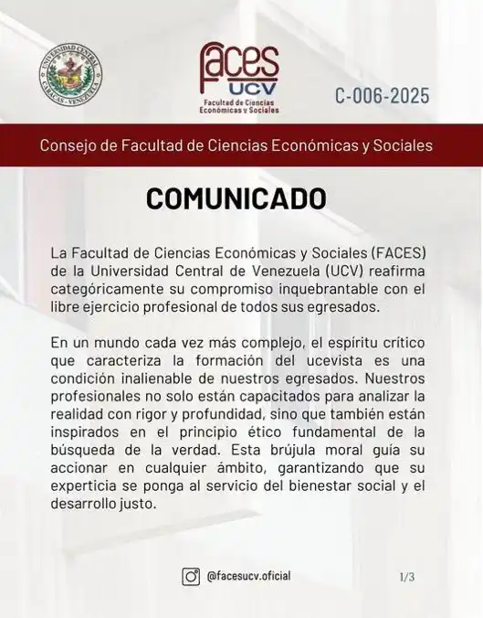 En un comunicado, publicado en su cuenta en Instagram, la facultad dice: «Rechazamos las aprehensiones de reconocidos economistas venezolanos por su ejercicio profesional, sin ningún debido proceso ni justificación alguna».