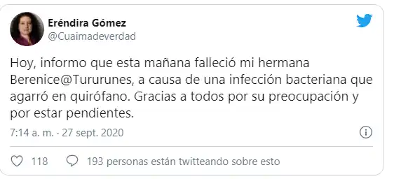 «Informo que esta mañana falleció mi hermana Berenice @Tururunes, a causa de una infección bacteriana que agarró en quirófano. Gracias a todos por su preocupación» escribió la también comunicadora.