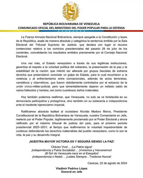 «La Fuerza Armada Nacional Bolivariana, siempre apegada a la Constitución y leyes de la República, acata de manera absoluta y categórica la sentencia emitida por la Sala Electoral del Tribunal Supremo de Justicia, que declara con lugar el recurso contencioso relativo a los comicios presidenciales del pasado 28 de julio de los corrientes, convalidando los resultados emitidos previamente por el Consejo Nacional Electoral».
