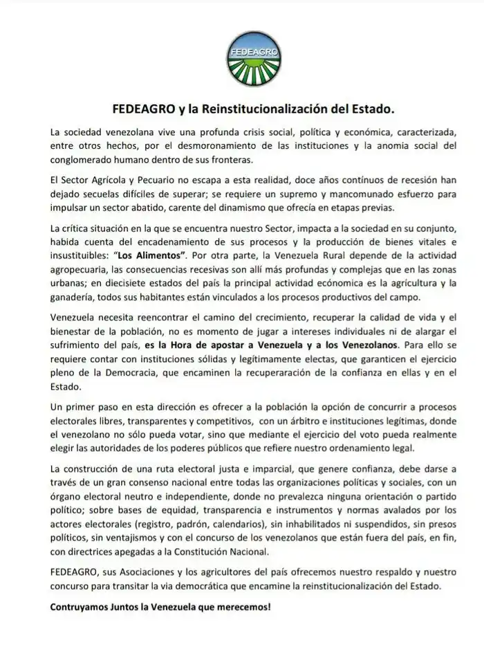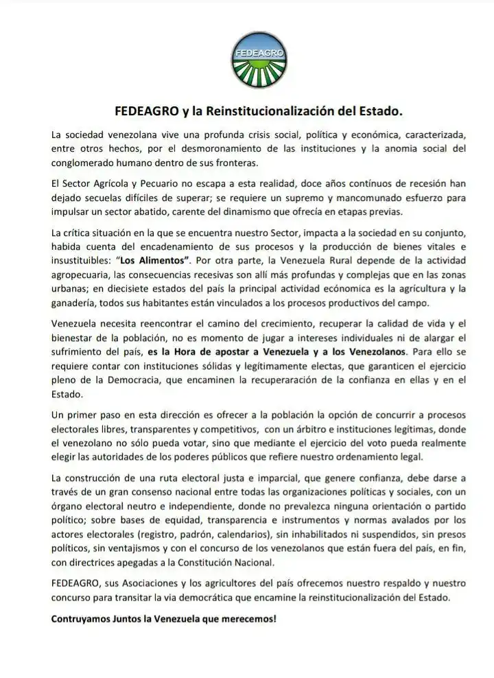 La Confederación de Asociaciones de Productores Agropecuarios de Venezuela (Fedeagro) pidió a la dirigencia política que se ponga de acuerdo. A través de un comunicado, el gremio exige que se logre un “gran consenso nacional”. El mismo se debe traducir en una “ruta electoral” para institucionalizar nuevamente al país.