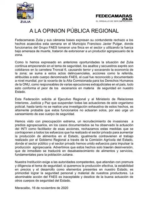 Fedecámaras Zulia emitió un comunicado en el cual advierte que hechos como el intento de extorsión por parte de funcionarios de las FAES en la entidad se traducirán en desinversión y escasez