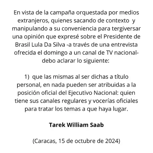 Lea también: Cancillería ACLARA: expresiones de Tarek William Saab sobre Lula da Silva son de carácter “personalísimo”