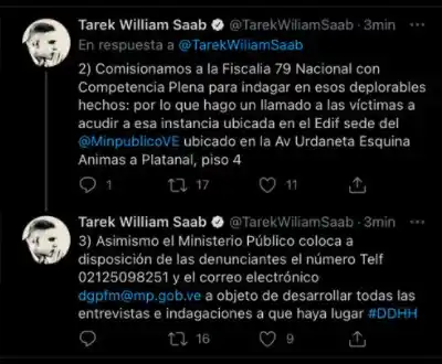 Asimismo, Saab instó a aquellas mujeres que tienen alguna denuncia que hacer de acoso o de abuso sexual, que acudan a la sede del Ministerio Público. Asimismo, puso a disposición de las víctimas un número telefónico un correo electrónico para ayudar en la investigación o denuncia, según el caso.