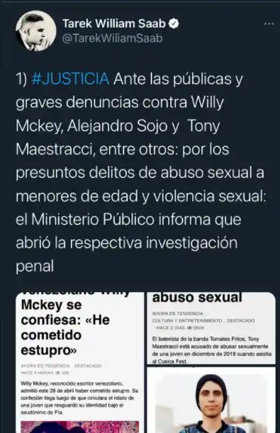 Tarek William Saab informó que se investigará el escritor Willy McKey y los músicos Alejandro Sojo y Tony Maestracci; luego de que varias mujeres los señalaron de acosarlas y abusarlas cuando eran menores de edad