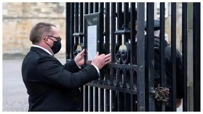 En Londres, los curiosos acudieron a ver el anuncio oficial del fallecimiento del príncipe Felipe, colocado solemnemente frente al palacio de Buckingham, la residencia oficial de la reina en la capital británica