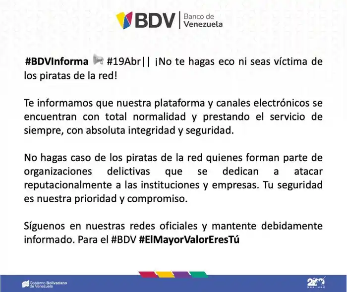 Sin mencionar si en realidad hackers intentaron vulnerar la plataforma, el Banco de Venezuela emitió un comunicado asegurando que sus servicios se encuentran en «total normalidad».