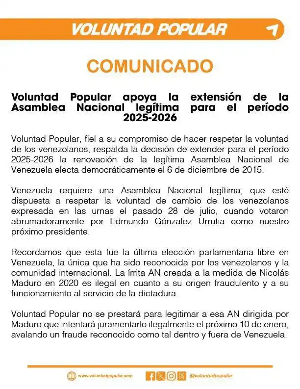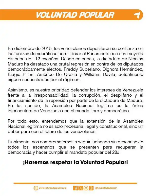 Así lo dio a conocer VP, fundado por Leopoldo López, a través de un comunicado, donde dice que Venezuela necesita una AN que » respete la voluntad» de los votantes expresada el 28 de julio.