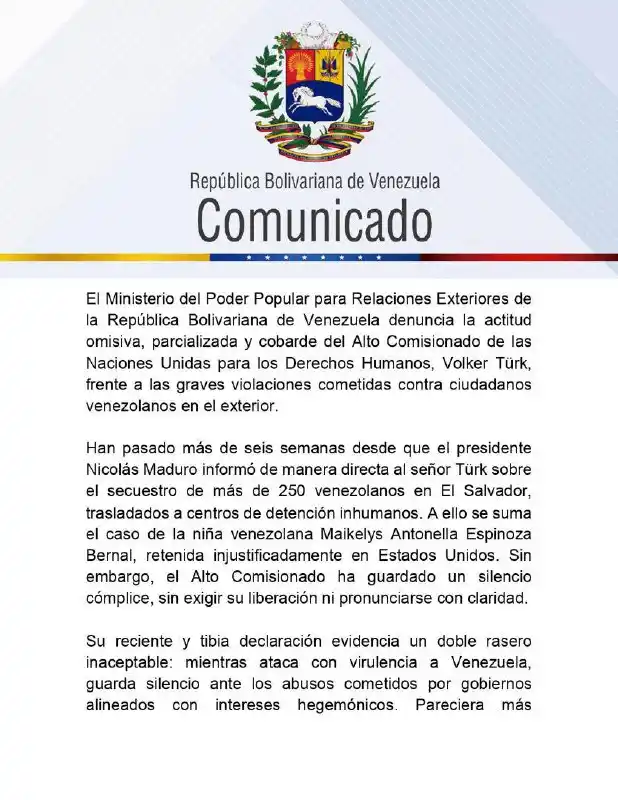 «Han pasado más de seis semanas desde que el presidente Nicolás Maduro informó de manera directa al señor Türk sobre el secuestro de más de 250 venezolanos en El Salvador, trasladados a centros de detención inhumanos», dice el comunicado publicado por el canciller Yván Gil.