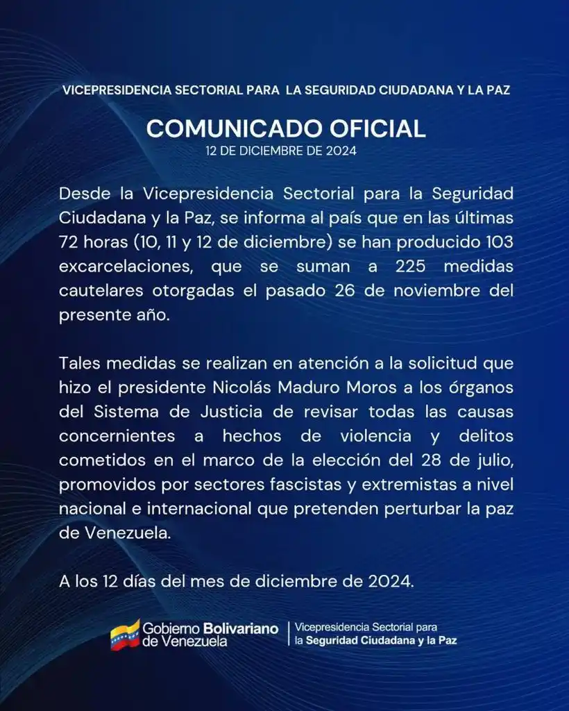 Desde la vicepresidencia sectorial para la Seguridad Ciudadana y la Paz informa al país que en las últimas 72 horas 10, 11 y 12 de diciembre se han producido 103 excarcelaciones, que se suman a 225 medidas cautelares otorgadas el pasado 26 de noviembre del presente año.