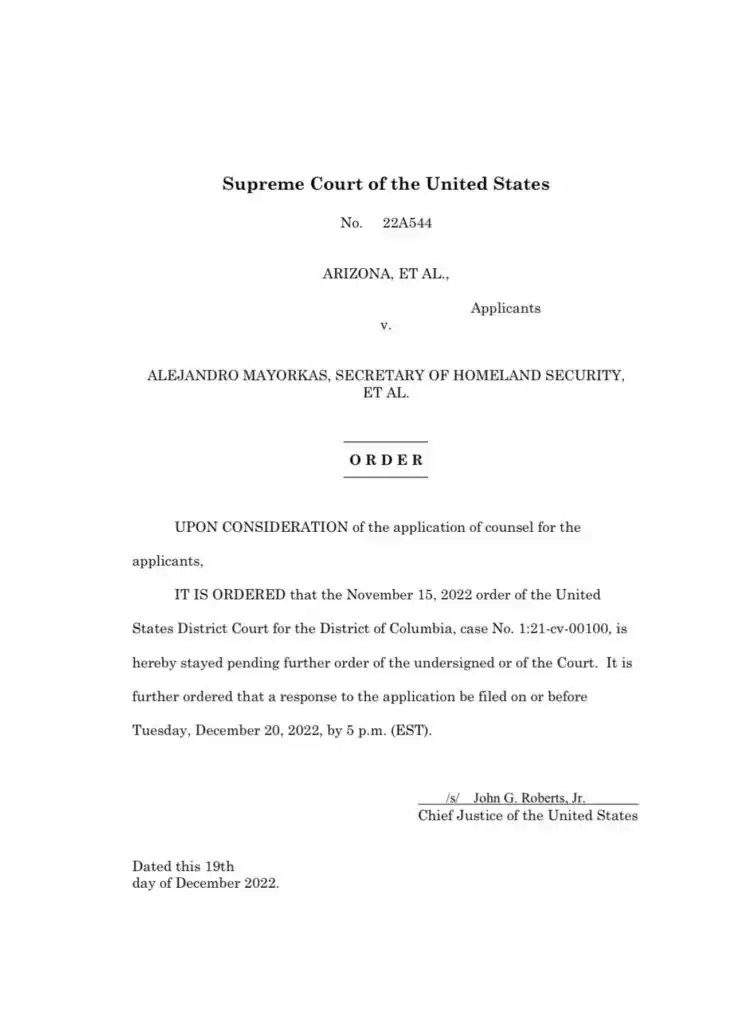 La Corte Suprema, paralizó el lunes el levantamiento del Título 42, el cual estaba previsto para el 21 diciembre, en respuesta a una petición de un grupo de 19 fiscales generales de estados, en su mayoría gobernados por los republicanos, que alegaban que su suspensión provocaría «un daño masivo e irreparable» en materia migratoria.