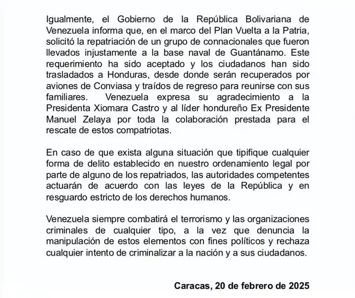 En su pronunciamiento, el gobierno se comprometió a que, en caso de que haya “alguna situación que tipifique cualquier forma de delito establecido” en el ordenamiento legal venezolano por parte de alguno de los repatriados, las autoridades “competentes actuarán de acuerdo con las leyes de la república y en resguardo estricto de los derechos humanos”.