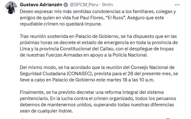 «Se ha dispuesto que en las próximas horas se decrete el estado de emergencia en toda la provincia de Lima y la provincia Constitucional del Callao, con el despliegue de tropas de nuestras Fuerzas Armadas en apoyo a la Policía Nacional», anunció el jefe del gabinete ministerial Gustavo Adrianzén vía la red social X.