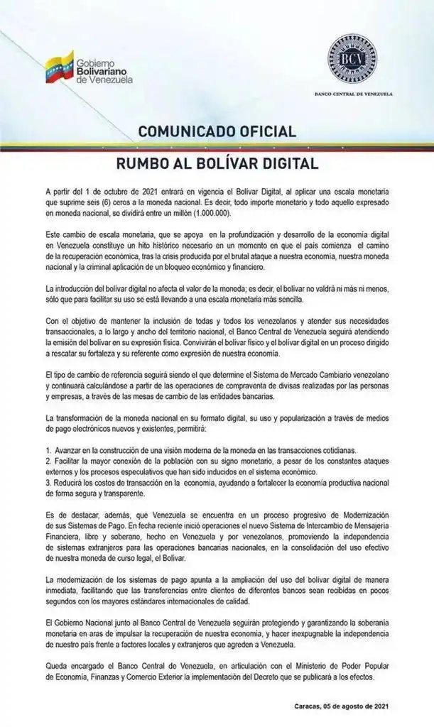 “A partir del 01 de octubre entrará en vigencia el “Bolívar Digital”, al aplicar una escala monetaria que suprime seis (6) ceros a la moneda nacional”, reza el documento.