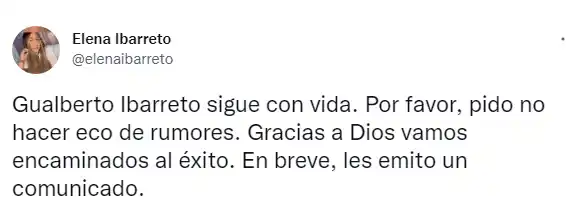 Ante esto, Elena Ibarreto, hija de Gualberto y portavoz de la familia se encargó de desmentir en varios tuits la información. La cual profundizó a las 9 pm, con el comunicado diario sobre la salud de su papá.