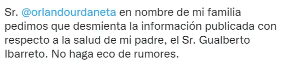 En su mensaje, Urdaneta, quien reside en Miami desde hace dos décadas, aseguró que Ibarreto había fallecido. «Sr. @orlandourdaneta en nombre de mi familia pedimos que desmienta la información publicada con respecto a la salud de mi padre, el Sr. Gualberto Ibarreto. No haga eco de rumores», le solicitó.